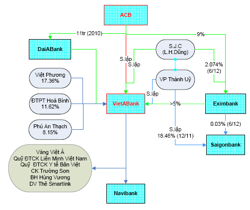 cùng nhìn qua chart mạng sở hữu phức tạp của hệ thống một số NHTM việt nam, mối quan hệ phức tạp thế này thì ra sao nếu một ngân hàng phá sản? em nghe nói sở hữu chéo nhằm lập một hàng rào phòng chống bị thâu tóm...: ACB-... ![]() ACB - Eximbank ![]() ACB-KienLongBank ![]() Vietabank ![]() more info: http://vietstock.vn/2012/10/mang-nhe...830-244747.htm |