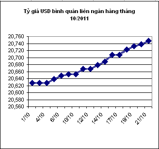 Với 11 lần nâng tỷ giá liên tiếp, USD đã cao hơn so với thời điểm Thống đốc NHNN tuyên bố tỷ giá cuối năm sẽ không biến đông quá 1% là 0,58% hay 120 đồng. NHNN công bố, tỷ giá USD bình quân liên ngân hàng áp dụng cho ngày 21/10 là 20.748 đồng, tăng 10 đồng so với hôm qua và là mức cao nhất từ trước tới nay. Tỷ giá trần áp dụng cho các NHTM hôm nay là 20.955 đồng. Như vậỵ, với 11 lần nâng tỷ giá liên tiếp trong tháng này, USD đã cao hơn so với thời điểm ngày 7/9 Thống đốc NHNN tuyên bố tỷ giá cuối năm sẽ không biến đông quá 1% là 0,58% hay 120 đồng. Tại các ngân hàng, tỷ giá USD hôm nay cũng được điều chỉnh tăng thêm 10 đồng ở cả hai chiều, cụ thể như sau: Ngân hàng BIDV niêm yết giá USD tại 20.940 – 20.955 đồng, tương đương tại Sacombank. Tỷ giá của Eximbank là 20.935 – 20.955 đồng. Tỷ giá của Vietcombank là 20.950 – 20.955 đồng, của ACB tại 20.933 – 20.955 đồng. ![]() Nguồn: SBV/CafeF Theo nguồn tin Vnexpress, các ngân hàng niêm yết giá USD là vậy, nhưng thực tế giá mua bán USD của họ cao hơn nhiều, đã vượt mức 21.000 đồng, thậm chí giá bán ra lên tới 21.700 đồng. Còn theo nguồn tin từ Vneconomy, sau nhiều ngày biến động chậm thì USD ngoài thị trường “chợ đen” tại Tp. Hồ Chí Minh hôm qua tăng vọt và lên tới 21.850 đồng, bỏ xa USD niêm yết trong ngân hàng tới gần 1.000 đồng. USD tự do tại Hà Nội cũng lên trên 21.600 đồng, cao hơn ngày hôm trước 60 đồng. Thanh Bình Theo TTVN |